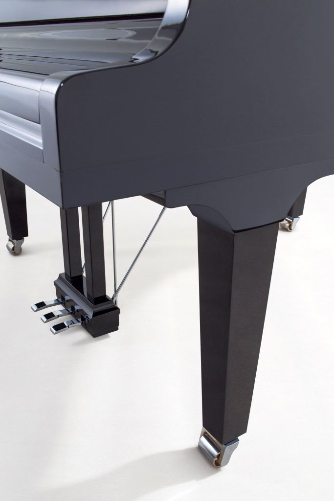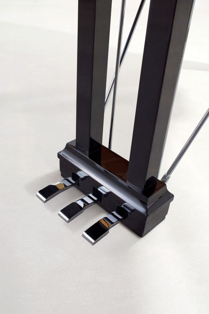 le modèle présente une indéniable qualité de clavier dont les revêtements de touches en résine acrylique et phénolique réduisent le vieillissement prématuré et accroissent la capacité d’absorption de la transpiration. un balancier très important dont l’axe a été placé assez loin du point de frappe cumule l’avantage d’une lourdeur indispensable pour la nuance et d’une fluidité évitant la fatigue des doigts et favorisant la rapidité de l’exécution. grâce aux marteaux allemands à l’impact mesuré, les vibrations transmises à la table d’harmonie sont denses, favorisant un registre grave-médium très chaud tandis que les notes aiguës se dessinent parfaitement, aidées avec efficacité par la présence d’une échelle duplex mettant les harmoniques en valeur. le chevalet de basses suspendu fabriqué en hêtre massif avec semelle en multiplis de hêtre présente des rainures qui réduisent le risque de sa déformation et son décollement de la table d‘harmonie. la juxtaposition de deux caractéristiques rarement conjointes, un toucher fluide et une tessiture veloutée, offre des sensations très particulières et ouvre le champ à une interprétation non formatée, extrêmement libre. on y retrouve ainsi l’émotion des romantiques français et la jubilation des mécaniques allemandes, preuve que les choix de l’usine trouvent leurs influences parmi toutes les écoles du piano et préfigurent peut-être les pianos de demain. le meuble cossu présente les parements indispensables à tout instrument décoratif, tels des chanfreins sur le couvercle, des pieds sabots, des roulettes doubles en laiton massif, le tout admirablement fini.
